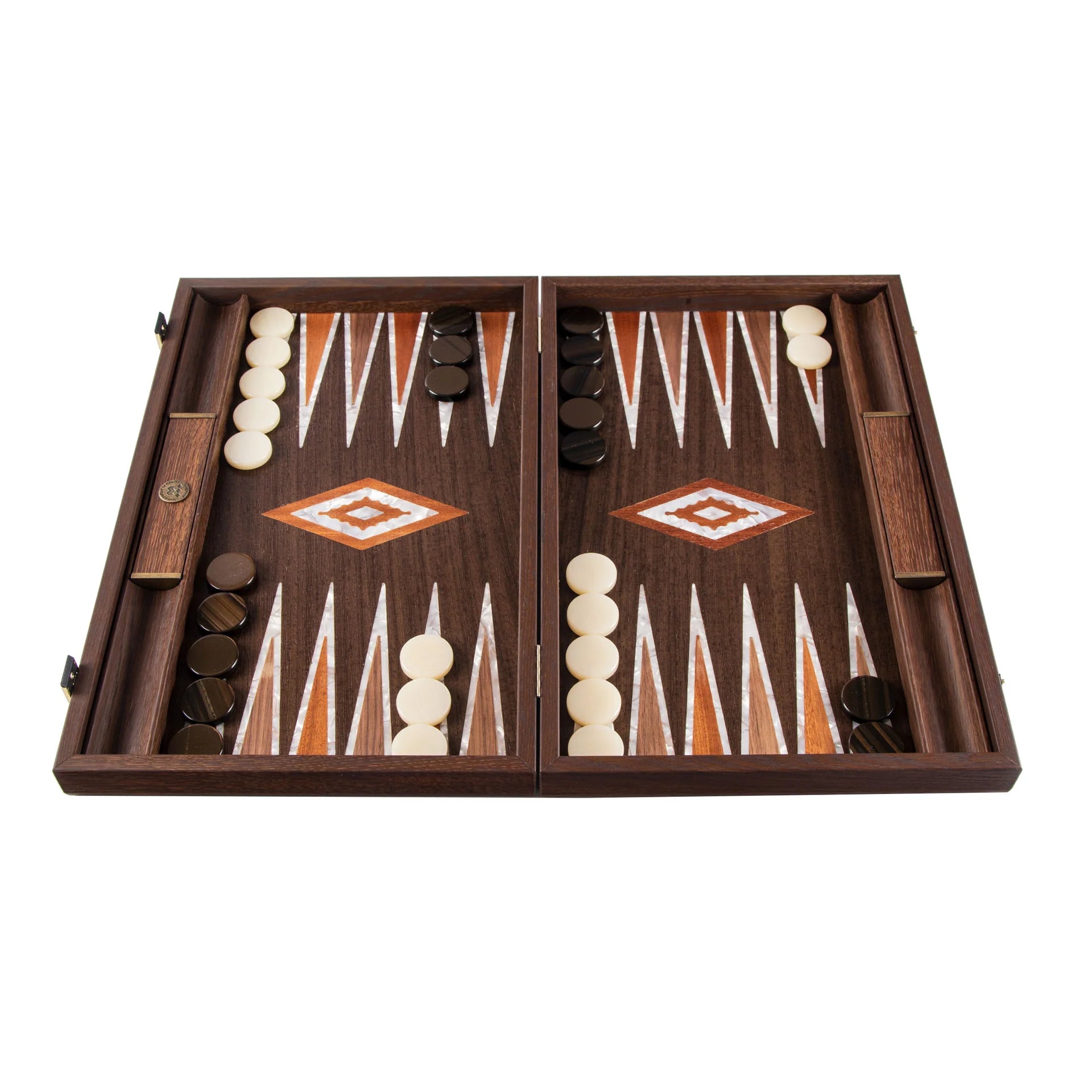 This backgammon is handmade using the art of marquetry (also spelled as marqueterie) which is the art and craft of applying pieces of veneer to a structure to form decorative patterns and designs.