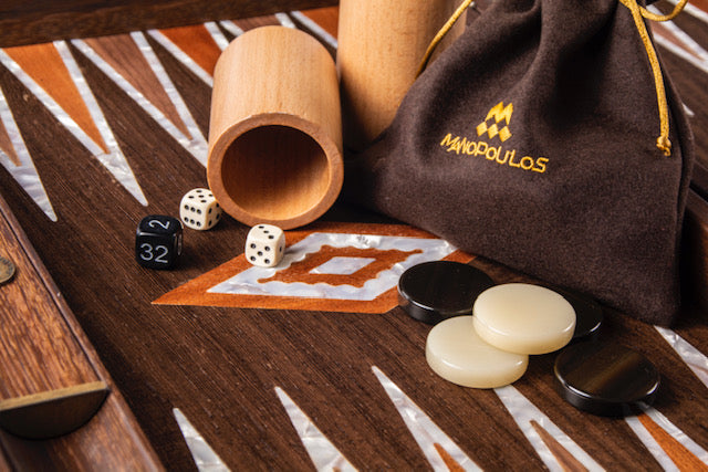 Walnut natural burl is a valuable wood for woodworkers and artists who enjoy working with such a unique and uncommon wood. The playing field looks irresistible due to the inlaid pearl elements which are a popular jewellery element because of its iridescent appearance. Each backgammon is a unique product of nature and results in an absolutely one-of-a-kind piece.