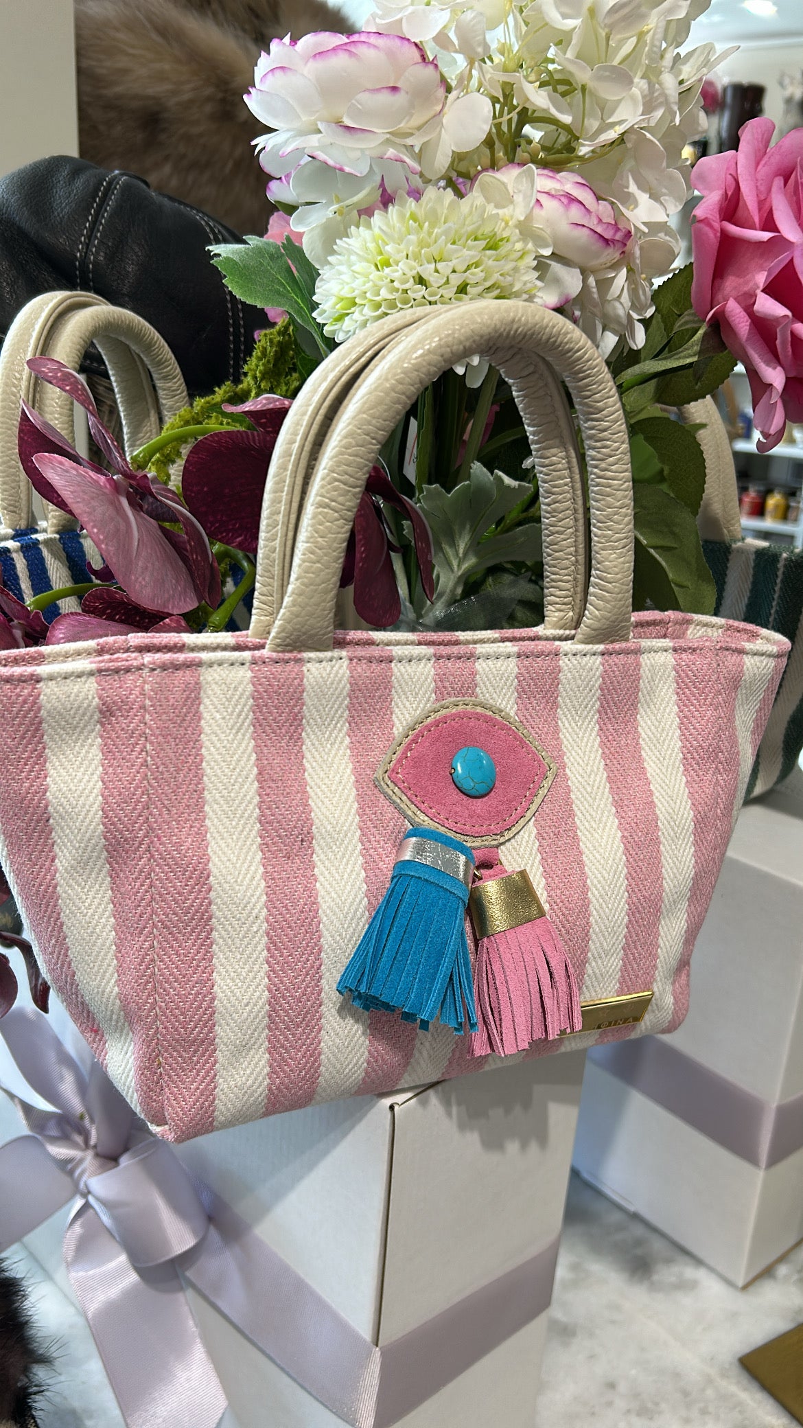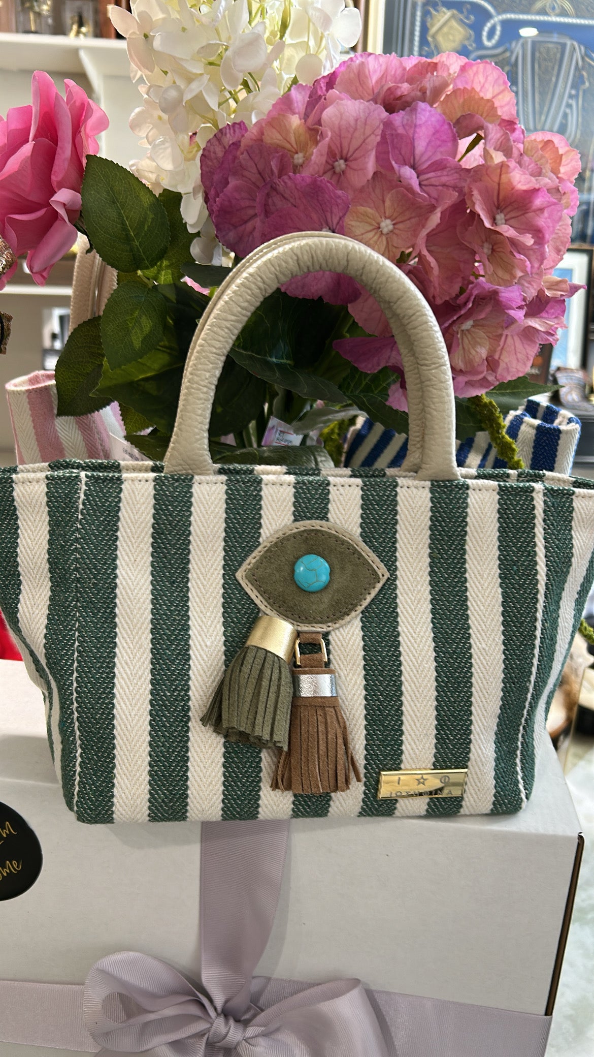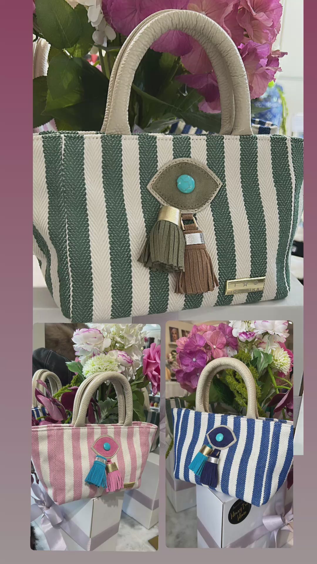 This gorgeous bag is a true standout piece, available in three beautiful colours. The bold stripes give it a fresh Mediterranean vibe, while the iconic “mati” (evil eye) detail adds a charming and protective touch. Made from high-quality fabric with soft leather handles, it’s surprisingly spacious — don’t be fooled by its compact look!