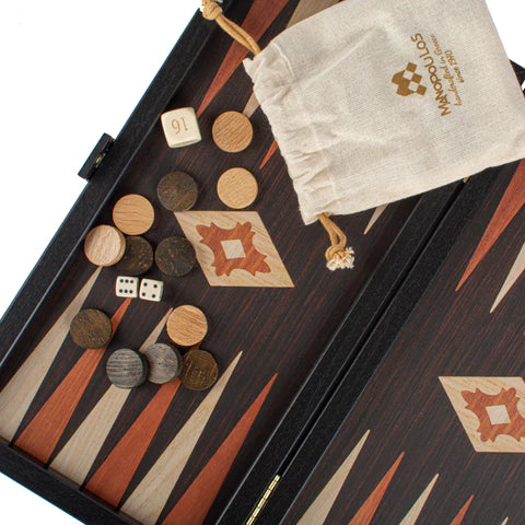 The Wenge colour backgammon set, offers quality materials and classic timeless design, at a smart price. The playing surface is printed (not inlaid) and features a central diamond design, with perfectly contrasting mahogany and oak points. The handcrafted Wenge Backgammon is available in 4 sizes.